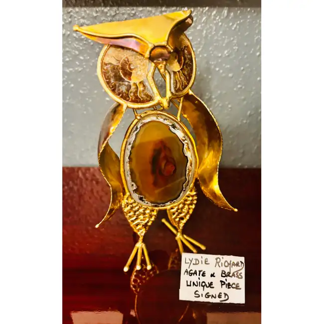 A whimsical, unique sculpture signed by Lydie Richard. This handcrafted owl features a polished agate stone body and eyes, framed by intricate, leaf-like brass metalwork. The warm, golden hues and natural stone patterns create a charming, sophisticated accent.”